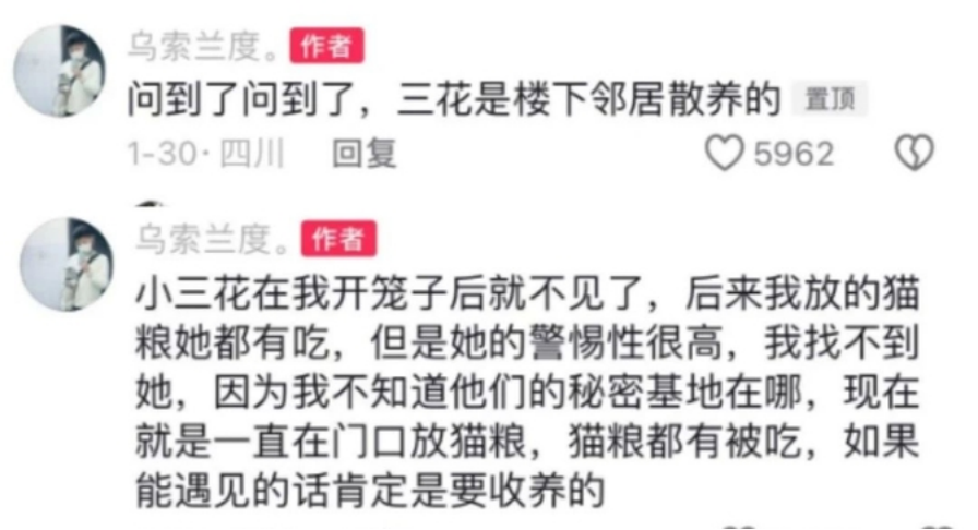 猫咪失踪了,一只机智的花猫却意外地成为了寻猫向导:你丢的是不是这只笨笨的小家伙?千万不要低估田园猫的智慧和脾气。你或许难以置信,有一只非常聪明的花猫,竟然能够主动引导人类,帮助他们找回走失的宠物。这是网友@乌索兰度的故事。她家的猫咪突然间就不见了,她在家附近搜索了很久,但一无所获。就在这时,平时并不怎么亲近她的花猫突然出现在她面前。那天,花猫一改常态,直接向她走来,并发出了一连串的叫声,似乎在示意她跟随。然后它走几步,就会回头看看,仿佛在引导她去某个地方。主人似乎理解了花猫的急切,便跟随它走了。花猫虽然焦急,但还是会时不时回头确认她是否跟上。这让妹子感到困惑,它到底想带她去哪里?