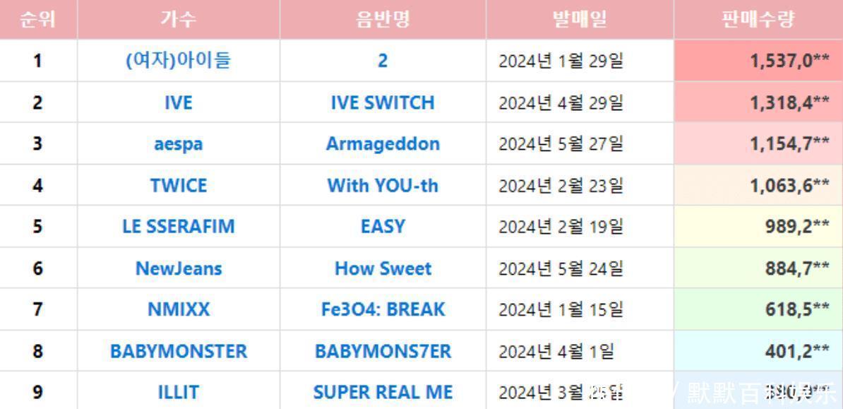 2024年KPOP女团最畅销专辑TOP 10:IVE第2、aespa第3……