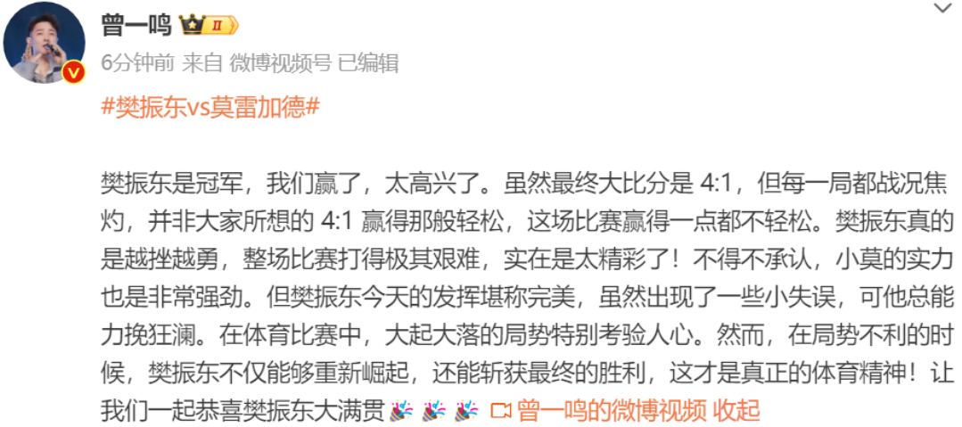 17金!樊振东夺男乒单打金牌,实现超级大满贯,现场观众掌声激烈