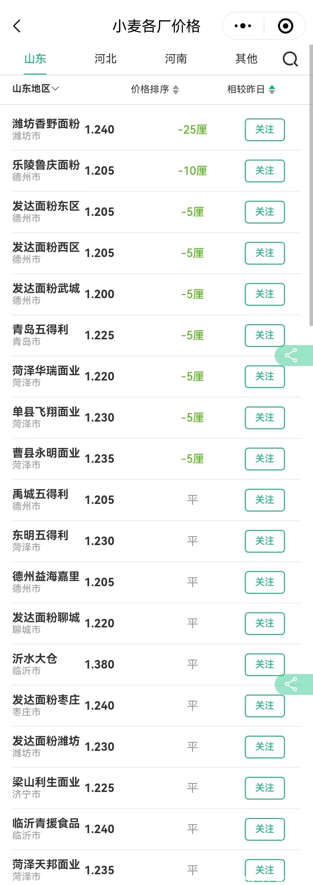 其中,在山东地区,潍坊乡野面粉下跌2.5分,执行价在1.24元;乐陵鲁庆面粉下跌1分,报价在1.205元;德州发达面粉,武城发达面粉、青岛五得利、菏泽华瑞、单县飞翔、曹县永明,企业落价0.5分,山东小麦报价跌至1.2~1.24元/斤,武城发达面粉报价跌至1.2元/斤!