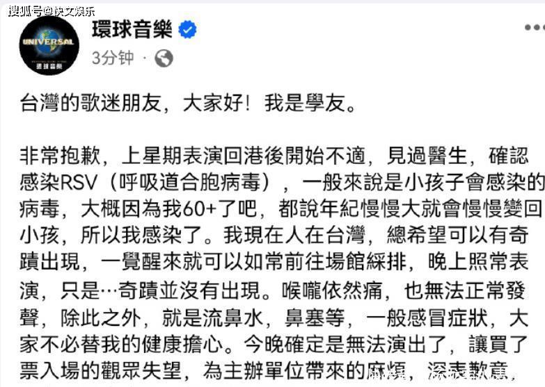 62岁歌神张学友突然病倒!确诊呼吸道合胞病毒,无奈暂停一切工作