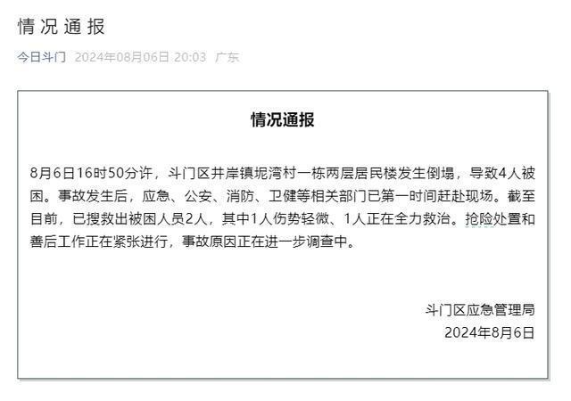 8月6日下午,广东省珠海市斗门区井岸镇坭湾村一两层居民楼倒塌,造成4人被困。斗门区应急管理局迅速行动,联合公安、消防、卫健等部门紧急救援。目前,已有2人获救,其中1人轻伤,另1人正接受全力救治。事故原因正在调查,抢险和善后工作正在进行中。