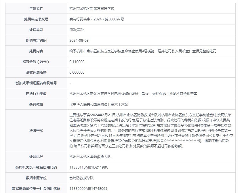 余杭新东方烹饪学校受罚