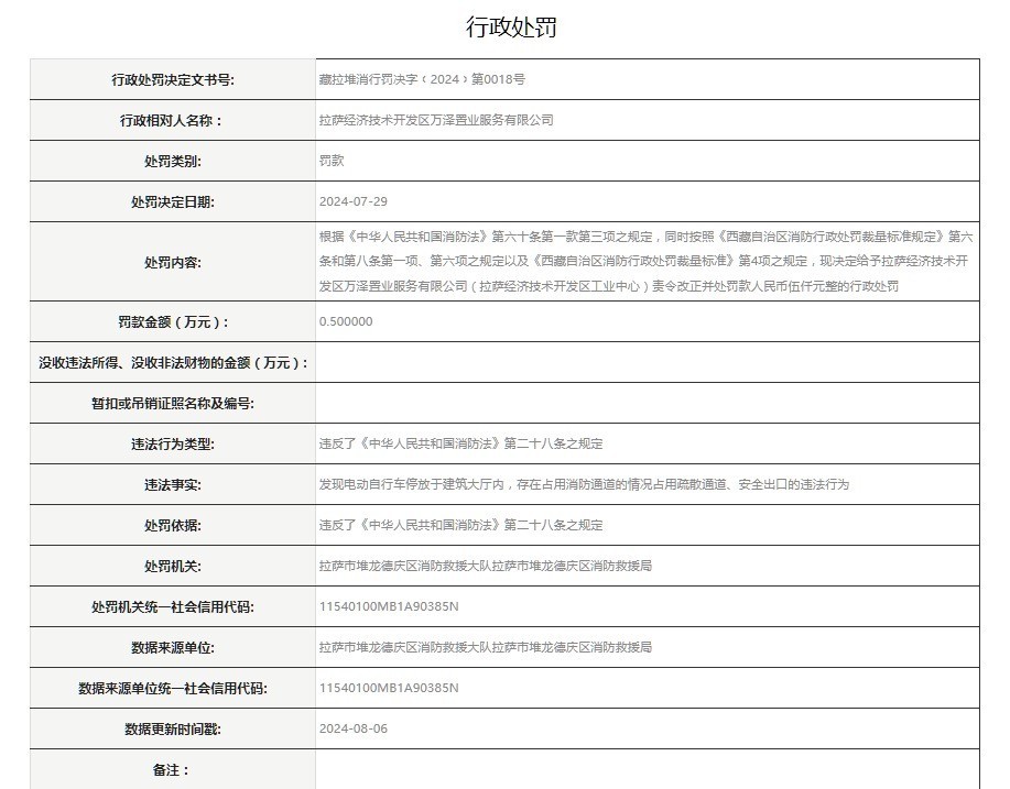 近日,拉萨经济技术开发区万泽置业服务有限公司因在建筑大厅内违规停放电动自行车,占用消防通道、疏散通道及安全出口,被拉萨市堆龙德庆区消防救援局依据《中华人民共和国消防法》和《西藏自治区消防行政处罚裁量标准规定》等相关法规,处以责令改正并罚款人民币5000元的行政处罚。该公司违反了《中华人民共和国消防法》第二十八条的规定,此次处罚旨在加强消防安全管理,确保疏散通道和安全出口的畅通。