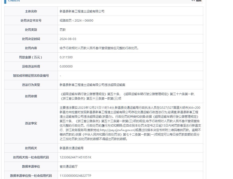 新昌县新奉工程渣土运输有限公司因违法超限运输,被新昌县交通运输局处以3115元罚款。事件发生在2023年12月21日11时14分,地点位于G527国道大明市段。该公司违反了《超限运输车辆行驶公路管理规定》和《浙江省公路条例》的相关条款。根据相关规定,新昌县交通运输局对其实施了行政处罚。