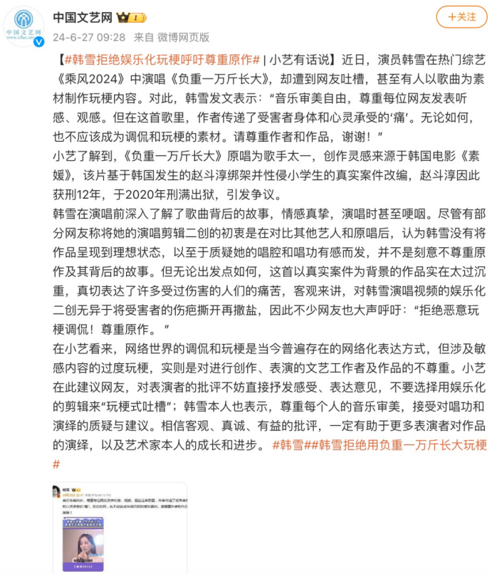 因此,当韩雪发文怒斥时,她的重点并不在于自己的唱腔是否完美,而是那份对严肃内核的坚守,和对玩梗行为的抵制。