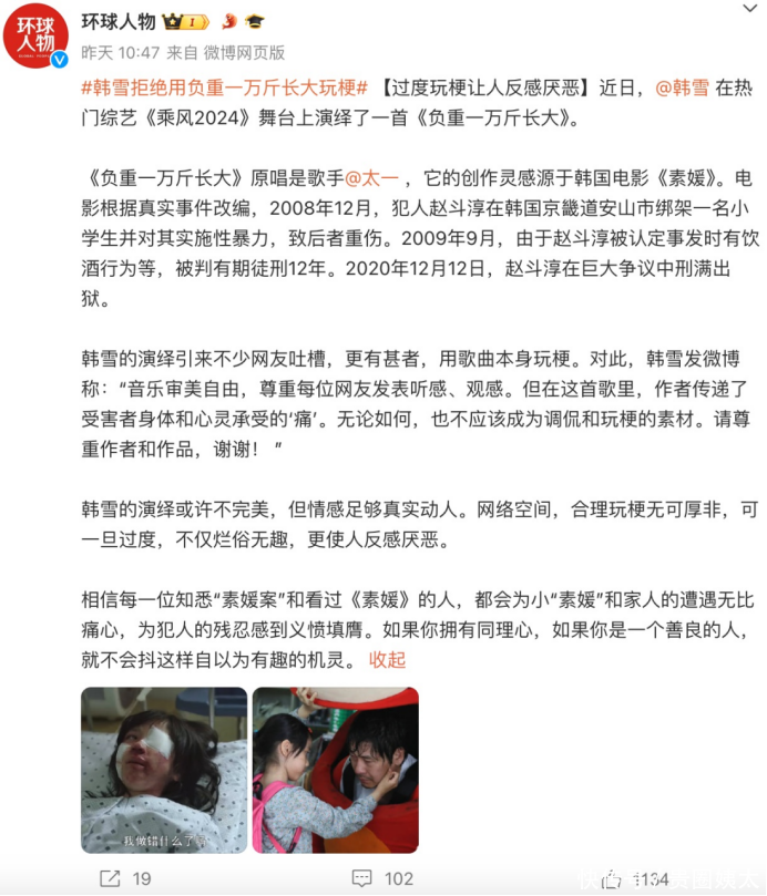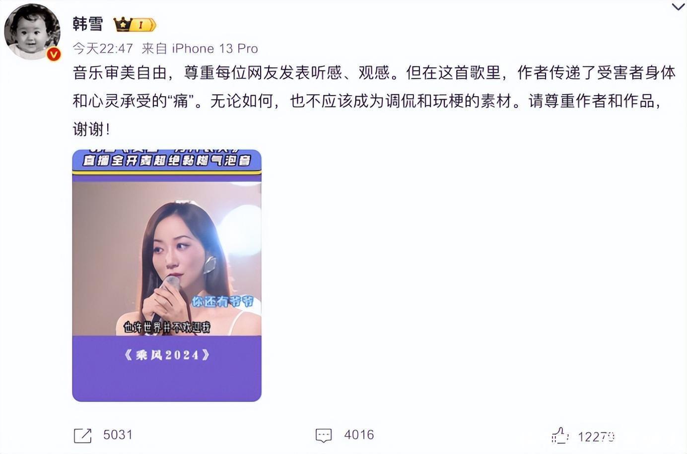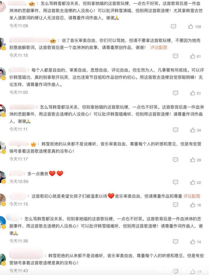 在此,我要澄清,并非禁止“韩雪”成为玩梗的对象,而是这首歌以及歌曲背后所承载的情感与人,不应被轻率地玩弄于娱乐之间。