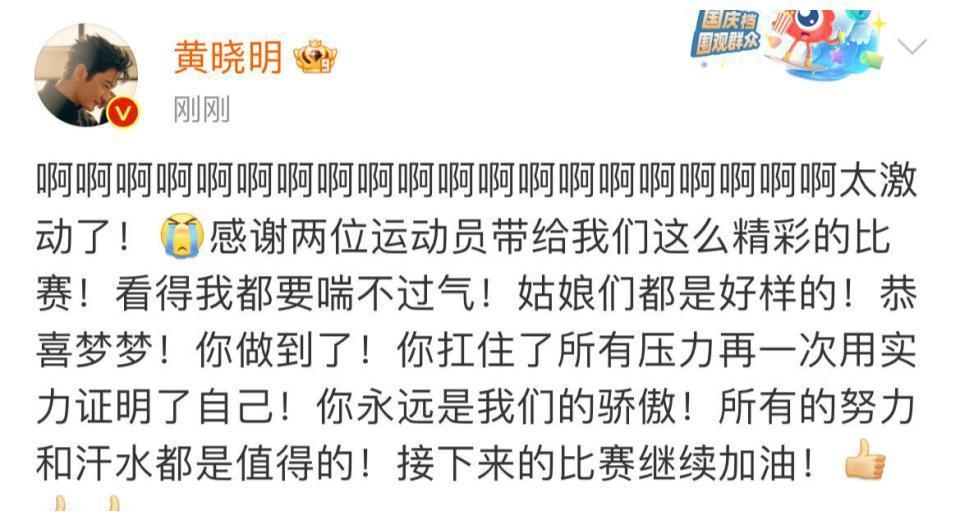 黄晓明观战陈梦激动难喘气!发文祝贺表妹卫冕:顶住压力再次正名
