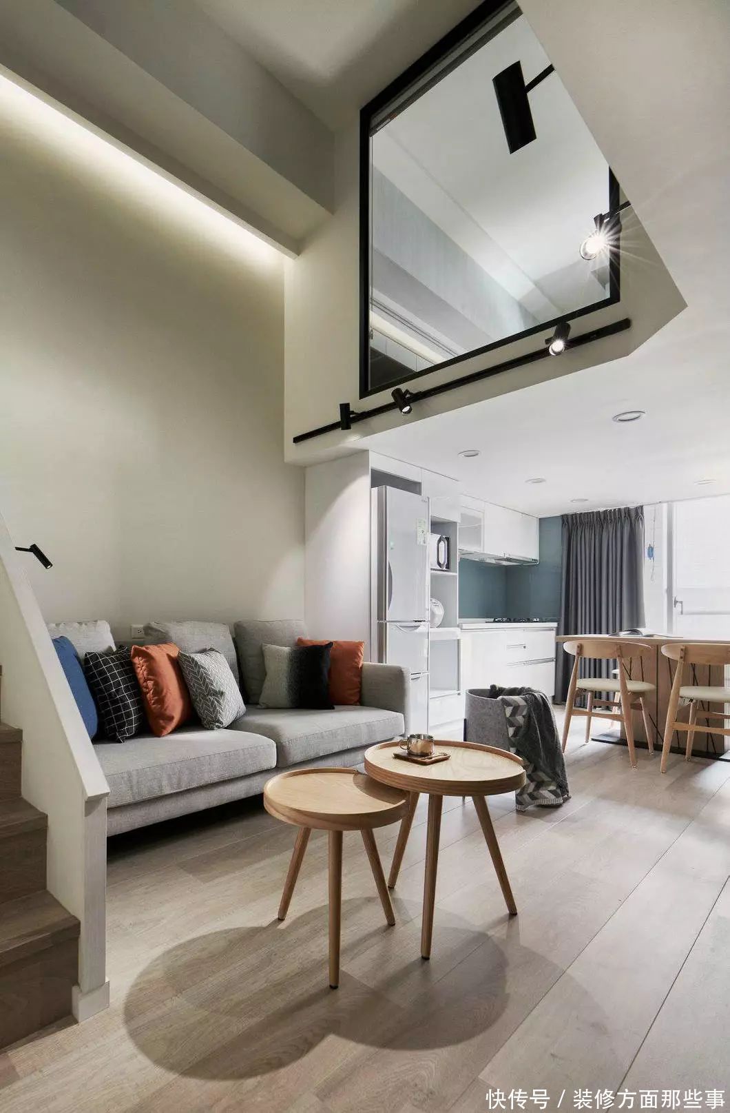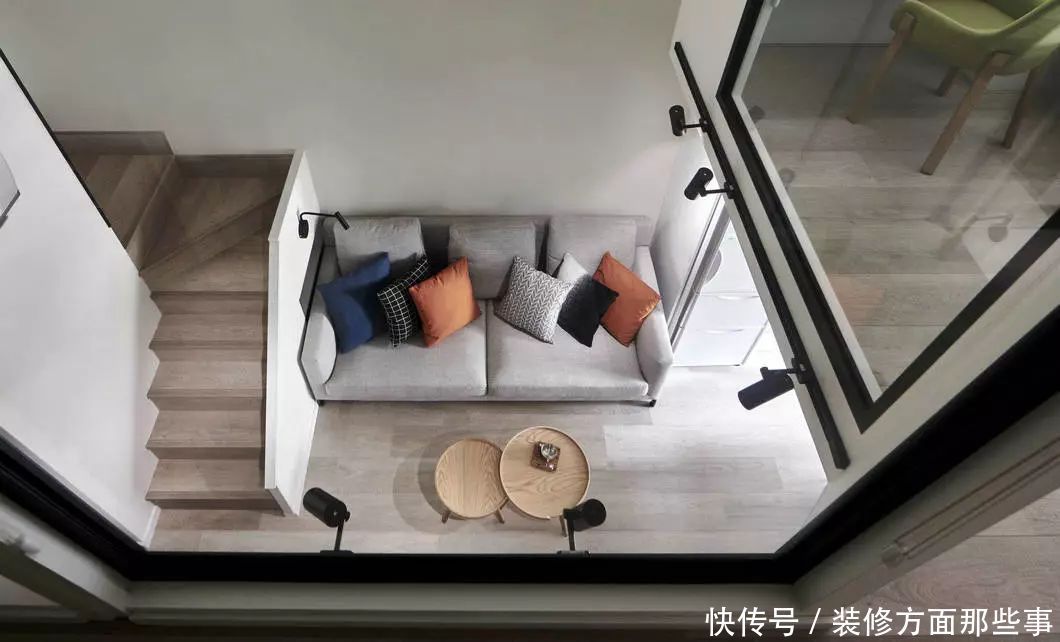 从二层向下看,小沙发上摆放了橙蓝相间的抱枕,搭配了圆的木质茶几,北欧风味满满!