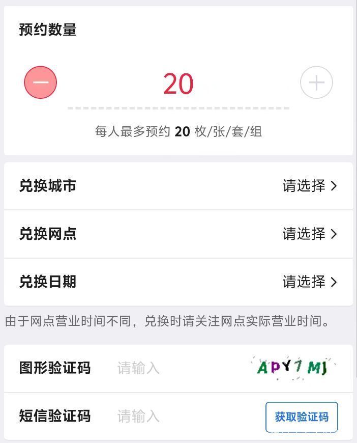 然后是填写预约数量,选择预约网点和兑换日期。