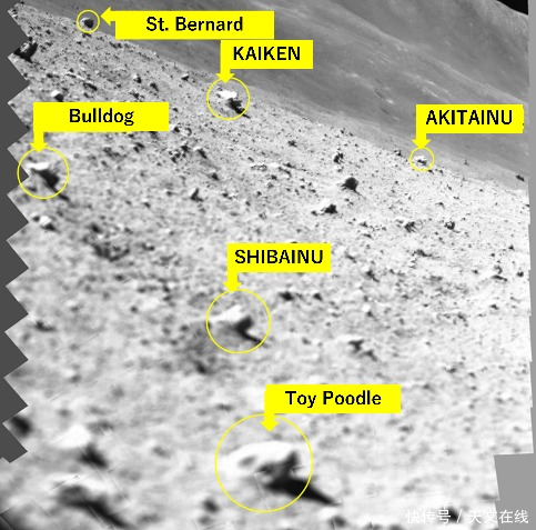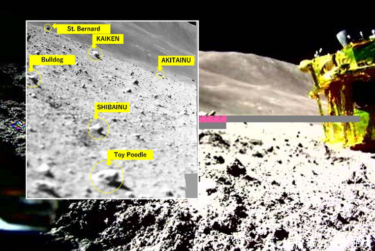 SLIM周日发回了其着陆区的照片,JAXA现在“把感兴趣的岩石分类,给每个岩石起个昵称,目的是通过名称顺利地传达它们的相对大小,”官员在一份英文新闻稿中补充说。图片中的昵称似乎是根据狗的品种来调用大小,从小巧的“玩具贵宾犬”到大而有力的“圣伯纳犬”。