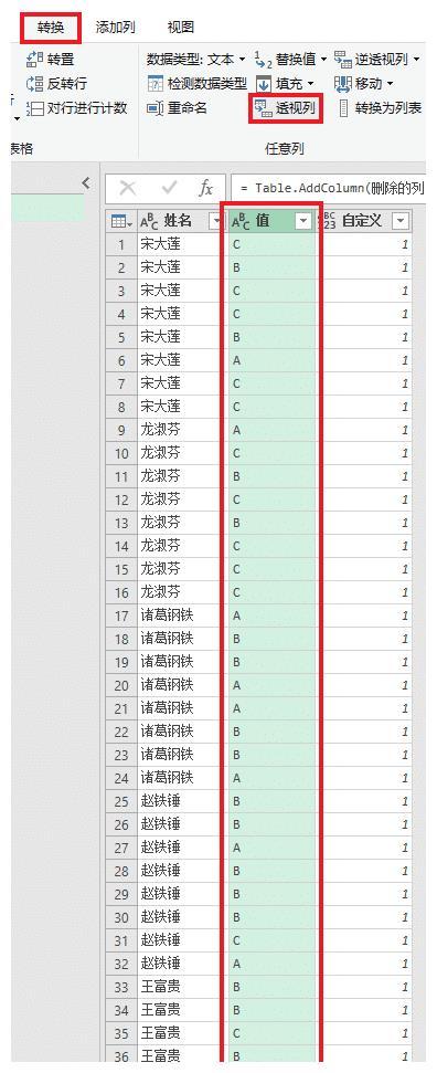 7.选中“值”列 -->选择菜单栏的“转换”-->“透视列”