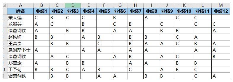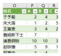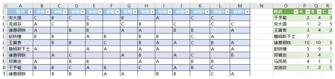 值区域是文本的 Excel 业绩表,如何统计每个人的各类评分总数?