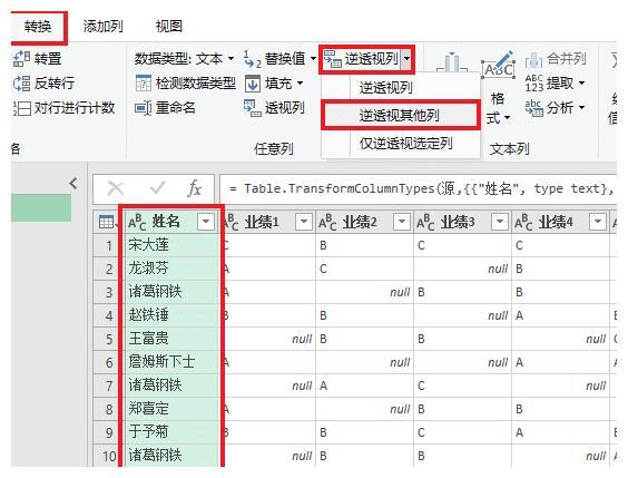 3.选中“姓名”列 -->选择菜单栏的“转换”-->“逆透视列”-->“逆透视其他列”