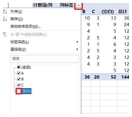 6.点开“列标签”旁边的箭头 -->在弹出的菜单中取消勾选“(空白)”-->点击“确定”