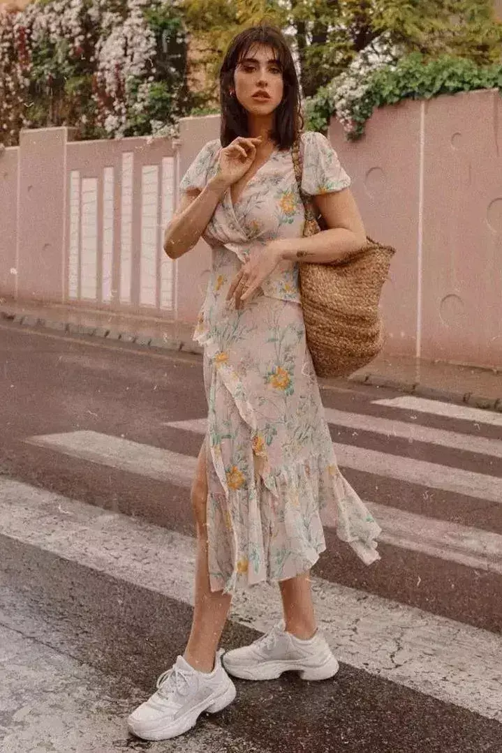 碎花裙可以说不挑人群,不管你是欧美的女性还是亚洲女性的面孔,都可以轻松驾驭碎花裙,脚上踩的小白鞋轻轻松松穿出少女感。