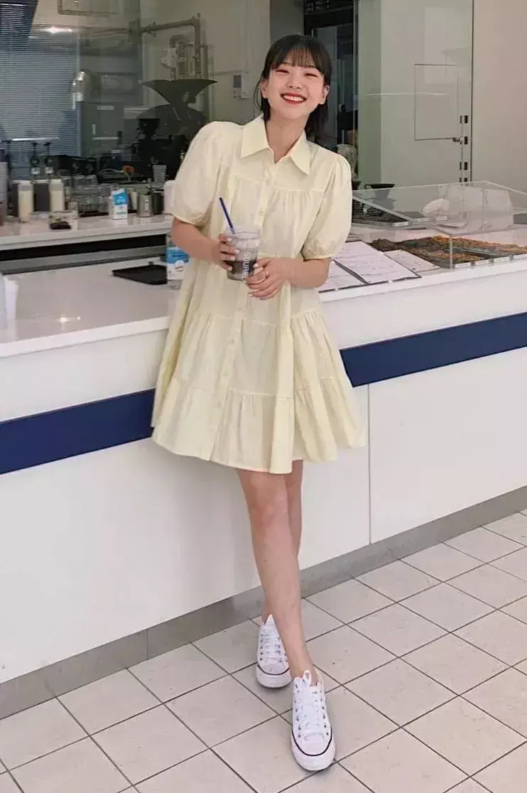 在这个夏天,想要自己变得更加的年轻貌美,有活力,可以选择初恋连衣裙,下面这一件浅黄色带的泡泡袖的衬衫连衣裙修饰肤色,而且裙摆属于伞状设计,对于胯宽的女性很友好,就算是梨形身材也可以尝试这一条连衣裙,脚上踩着一双白色的帆布鞋,显得更加的休闲,有活力,秒变成初恋女友,甜美又可爱。