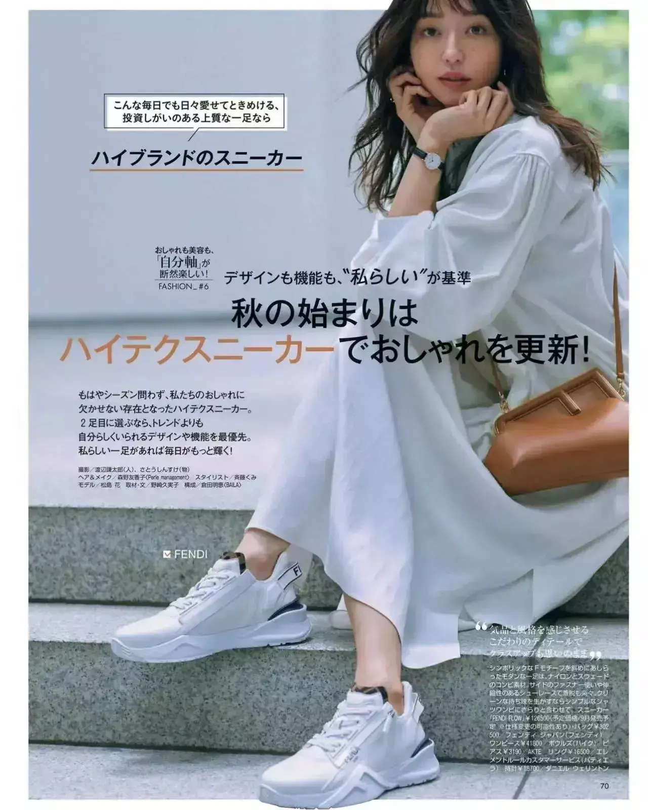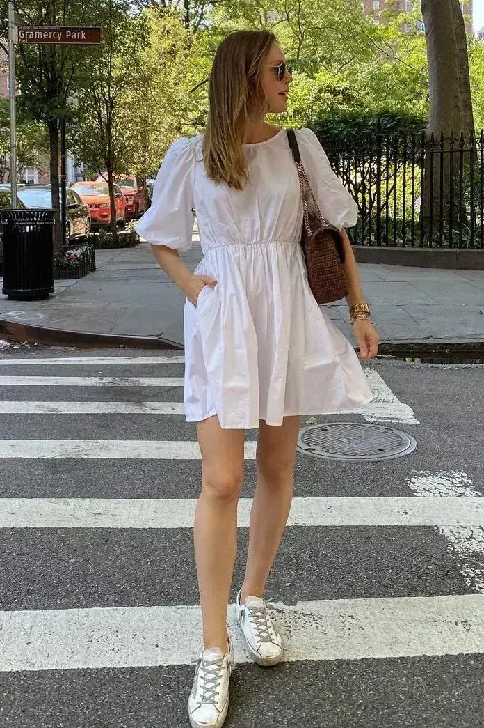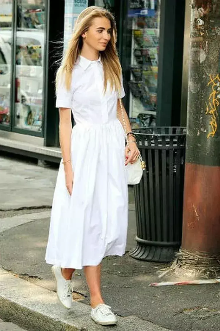 如果你选择的是一件纯白色的衬衫连衣裙,这时候选择的小白鞋颜色要有点差别,才不会显得过于单一。下面这位模特穿的小白鞋属于米白色,形成了一个色差感,看起来自然会更时髦。