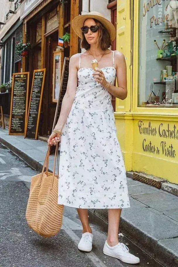 有的时候为了要整个穿衣造型变得更加的时髦,觉得小白鞋过于单调的情况下,你可以向下面这位博主身穿一件白色的吊带碎花连衣裙,能够轻松展现自己的手臂线条和锁骨优势,抢眼又抢镜,而且写的不会那么的单调,会更加的精致时髦。