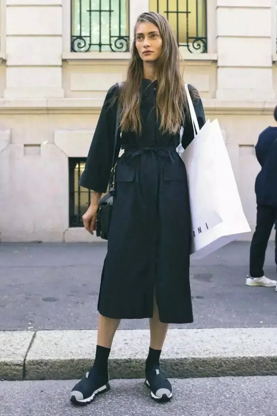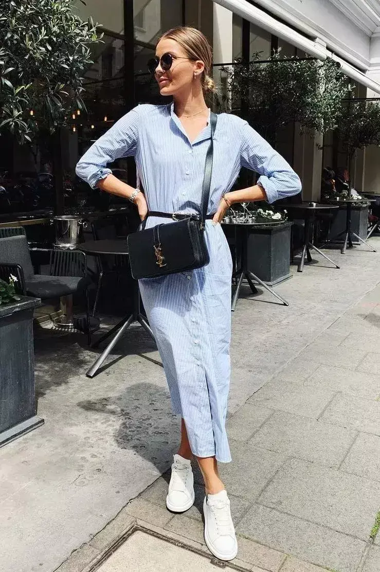 日常出行可以用运动鞋来混搭,无疑是正确的时尚潮开方式,例如下面这位素人长款的条纹衬衫连衣裙,搭配上平底的运动鞋,画的一款黑色的时尚小包包,带的一款小墨镜,又沙又美。