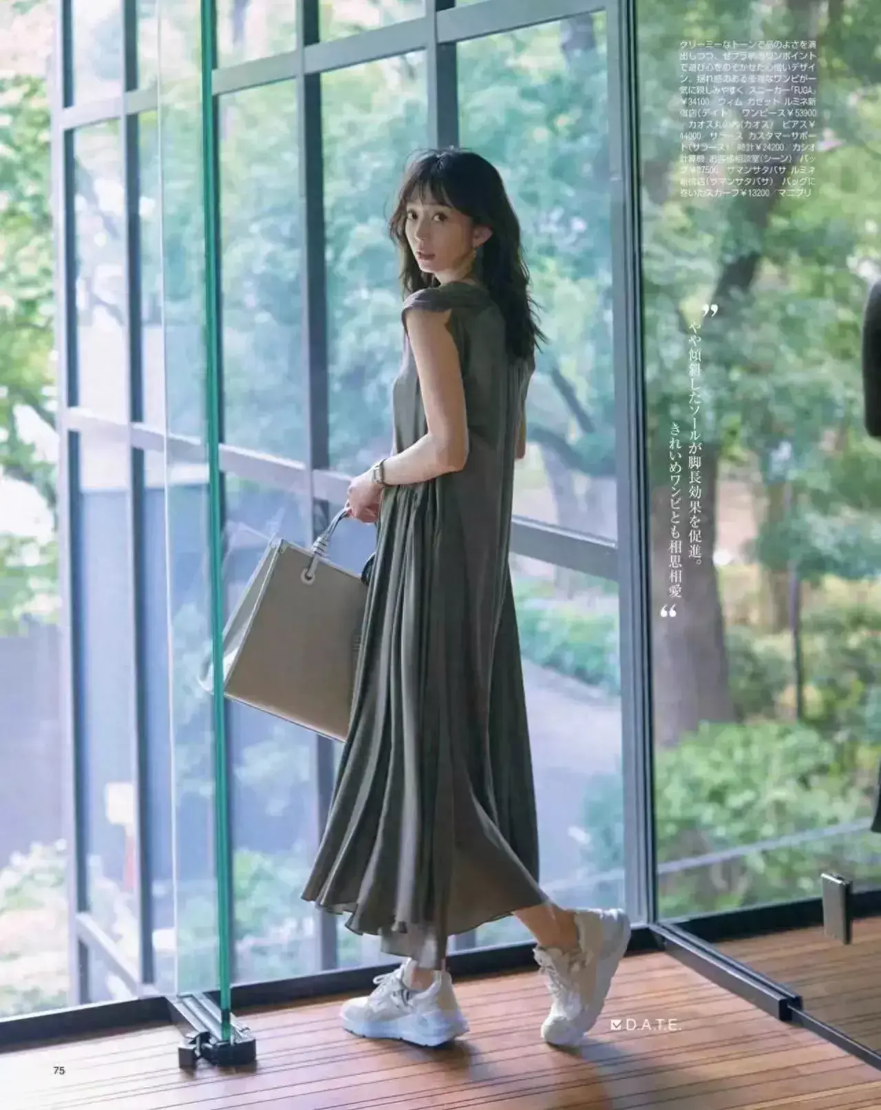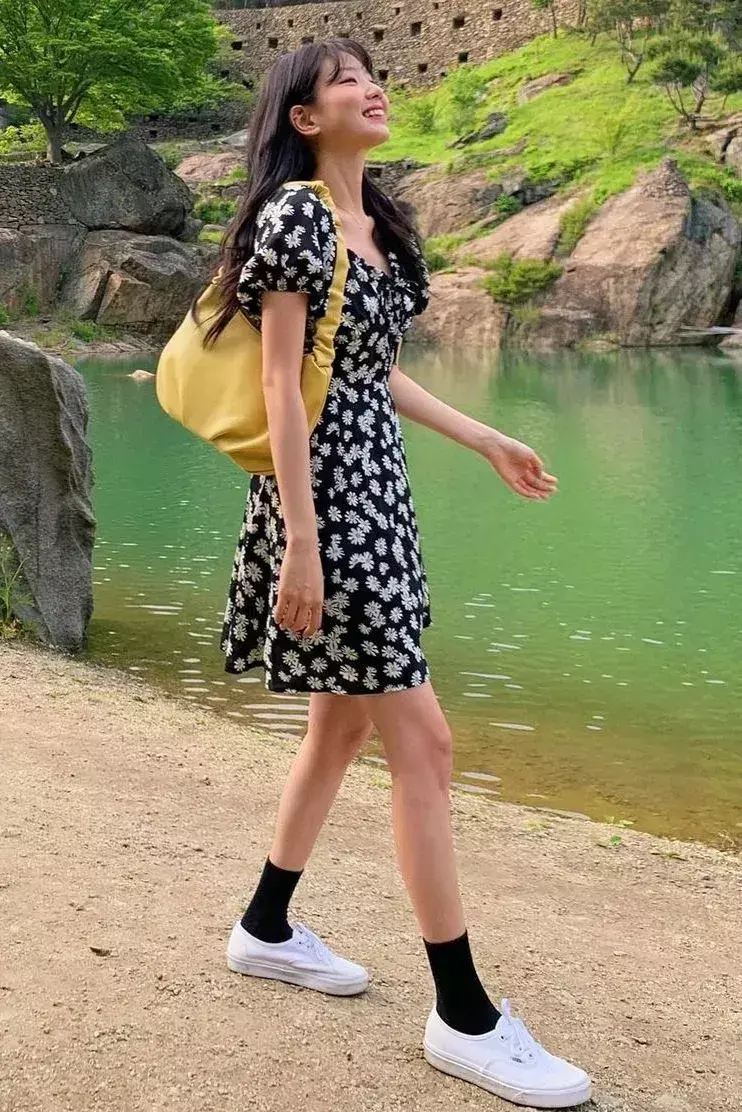 如果你所在的城市天气比较凉爽的情况下,可以选择像下面这位素人穿的厚底运动小白鞋搭配上水墨印花的连衣裙,这样的穿搭会更舒适,而且厚底的运动鞋上脚之后不累脚。