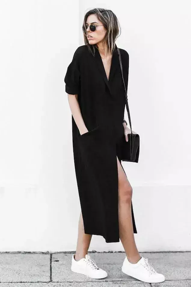 当然,我们也可以用一件宽松长款的白色衬衫搭配上小白鞋,这样的穿搭属于下半身失踪的穿搭技巧,能够展现出自己大长腿优势,显高又显瘦。