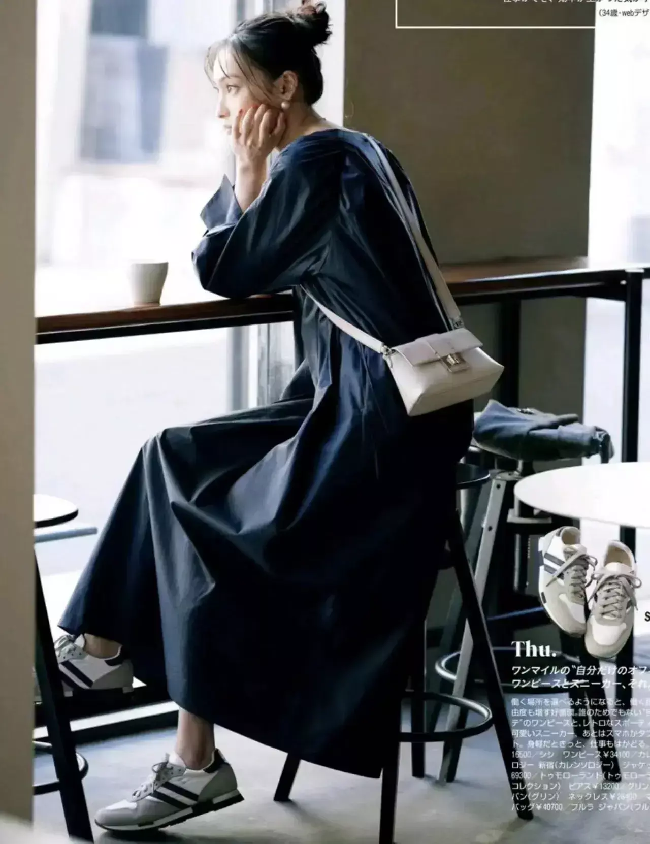 这个时候选择薄款的小白鞋来搭配就够了,因为这一件衬衫连衣裙属于深色系,这种藏蓝色的连衣裙很百搭耐看。