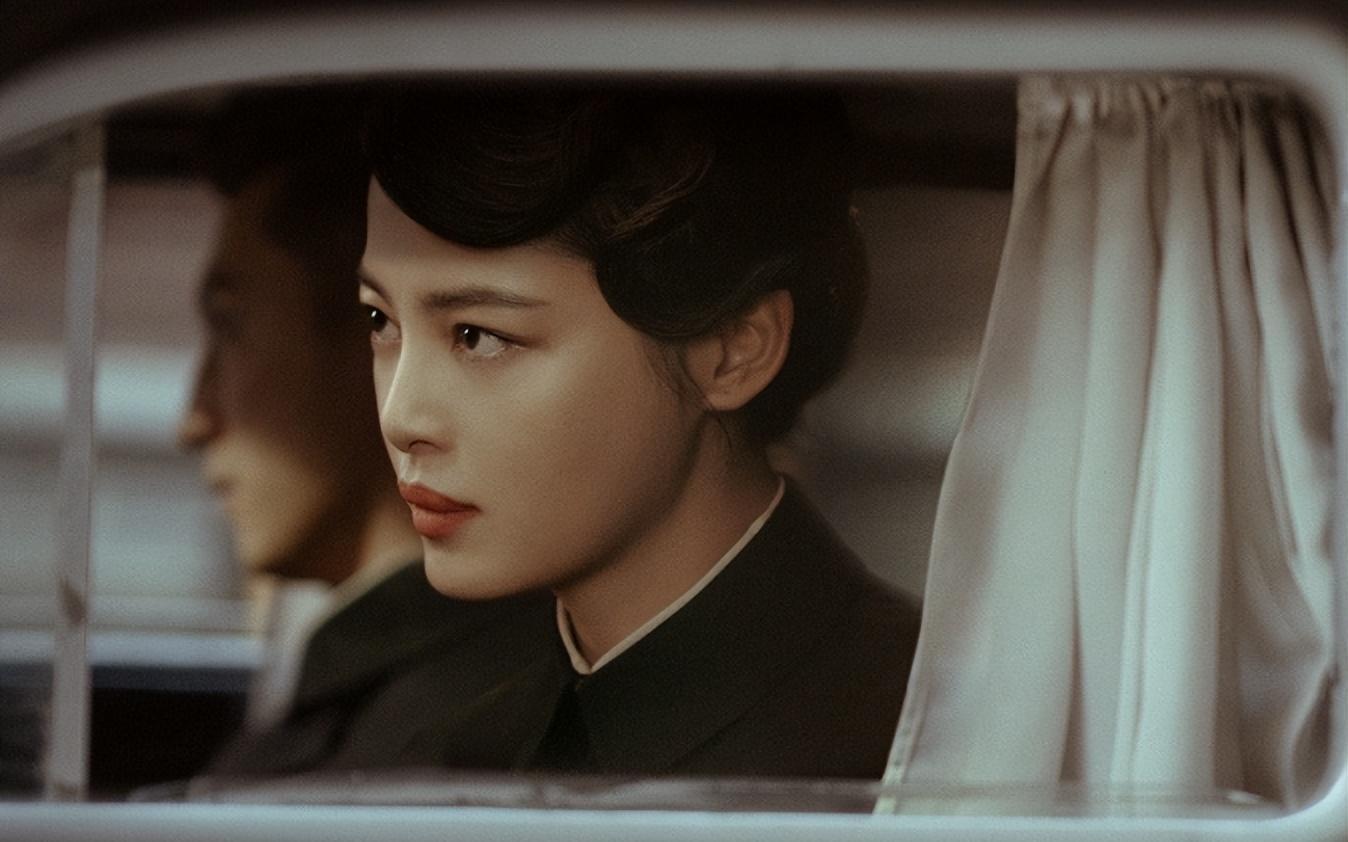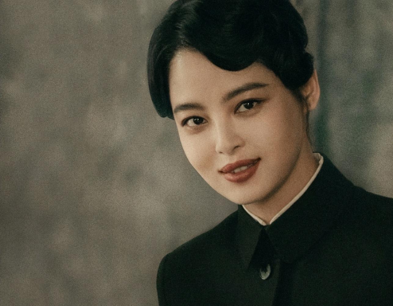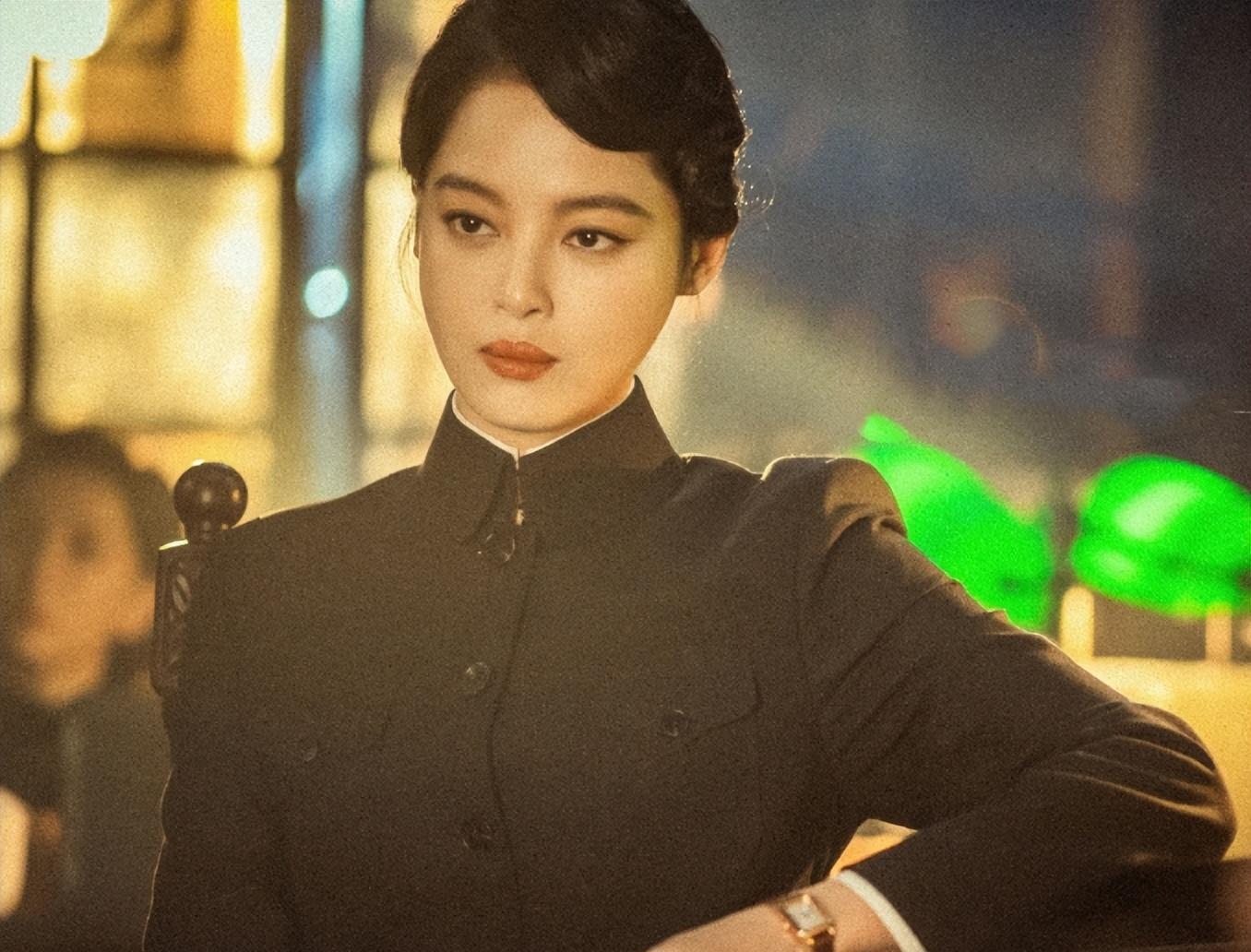 剧照中辛芷蕾穿着黑色中山装,眉目间有着军人的硬朗之气,展颜一笑明艳大方,看起来高深莫测。