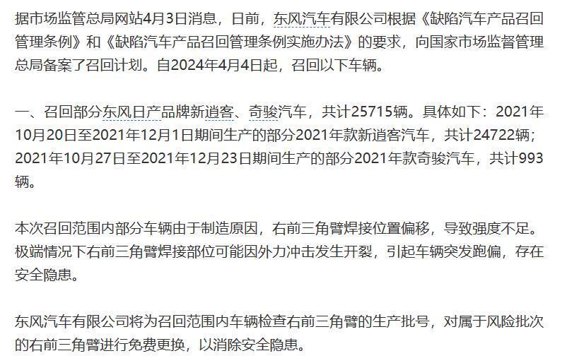 东风汽车发布召回计划,有涉及日产逍客和奇骏,缺陷问题比较严重