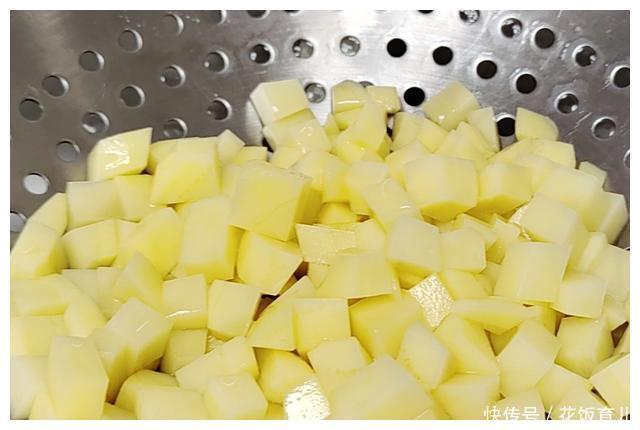 4、我喜欢吃土豆所以我准备搭配1个土豆进去土豆先去外皮接着切成和鸡丁差不多大小的丁然后再用清水把土豆丁清洗一下把表面的淀粉清洗干净洗好后倒出控水备用。
