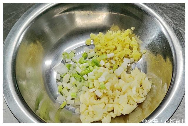 7、还要准备一些必不可少的增香料头生姜有去腥增香的作用把生姜切成姜末。蒜子有增香提味把蒜子切成蒜末。小葱有增香配色把小葱切成葱花切的时候把葱白和葱绿分开放。