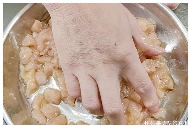 3、加入6克玉米淀粉下手抓拌均匀让鸡肉都能均匀地包裹上一层薄薄的淀粉这样可以锁住鸡肉的水分不流失。最后还要加入50克食用油搅拌均匀加油可以让鸡肉不会相互粘在一起在后期滑油的时候更容易滑散。搅拌均匀后放一旁腌制20分钟。