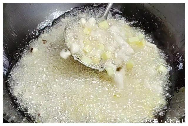 1、大火把锅烧热后倒入600克食用油油温5成热时把控水的土豆丁倒进锅内过油保持大火多搅拌让土豆丁受热均匀要一直把土豆丁炸到有点上色就可以。这个过程我大概用了1分钟左右的时间。