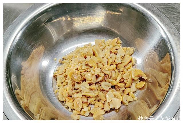 8、另外这道菜还要有一个香脆的口感所以就要用到油炸花生米为了口感更好先把花生米的外衣去掉然后再用刀把花生米压碎些即可。