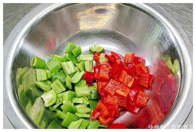 6、这道菜还要配点辣椒进去这次我用的辣椒不是很辣的主要是要用来配色让菜肴的颜色更丰富好看把青辣椒和红辣椒切成小丁备用。