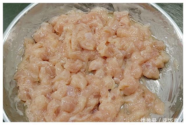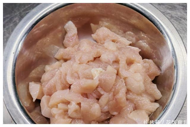 1、今天我们做这个道菜选用的是2块鸡胸肉先把鸡胸肉片成0.7厘米的薄片切好后再切成0.7厘米的长条最后再切成0.7厘米宽的小颗粒。可以把鸡胸肉放冰箱先冷冻一下这样切起来就轻松了。
