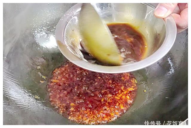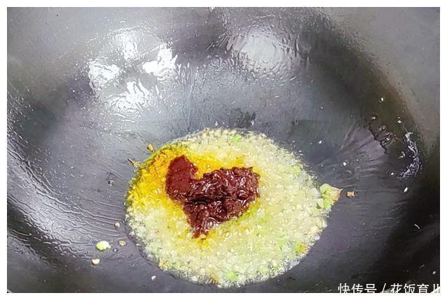 4、锅留30克底油中小火把葱姜蒜倒入锅内炒10秒炒出料头都香味香味出来后加30克豆瓣酱进去炒出红油炒出香味豆瓣酱下锅后大概炒10秒左右就可以搞定。
