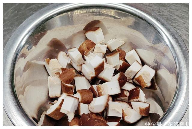 5、我还准备了3朵新鲜的香菇来作为配菜香菇可以增加菜肴的风味把香菇也切成鸡丁大小的香菇丁备用。没有新鲜香菇的也可以用干香菇只不过干香菇要提前1个小时用清水泡发。