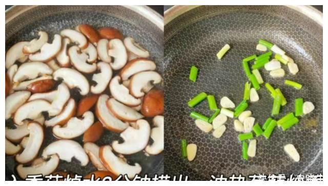 第六步起锅加上适量冷水倒入香菇焯烫出来这样香菇的口感会更好最后沥干掉表面水分。