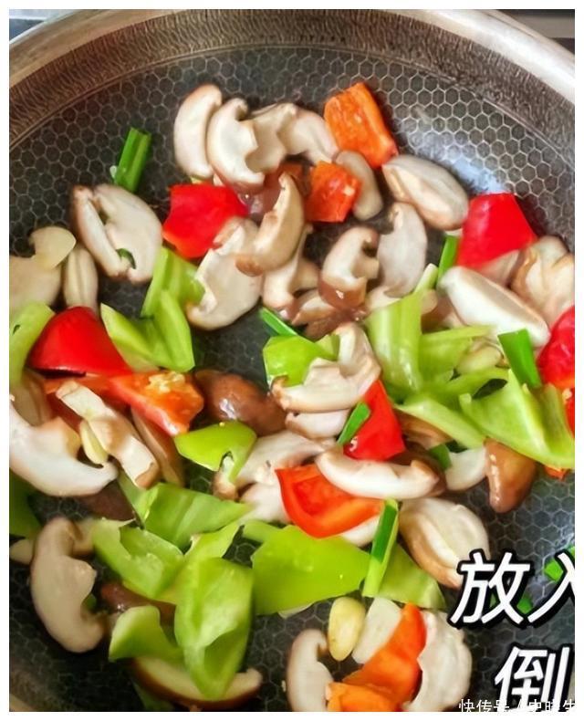 第七步锅底继续加上食用油油热后放入葱段和蒜片迅速将其炒香倒入香菇炒至变软倒入青椒和红椒炒至断生。