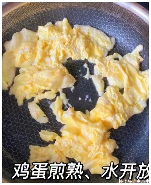 第五步锅底提前烧热乎加上若干食用油蛋液淋入到锅里中小火慢慢煎熟让鸡蛋煎至成型迅速炒散。