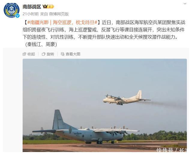 4月7号稍晚些时候,南部战区又对外发布消息,指出南部战区海军航空兵某单位正在进行跨昼夜飞行训练,反潜飞行训练等科目,主要针对的是在未知条件下的连续性对抗性的训练不断提升部队快速出动和全天候搜攻潜作战能力!