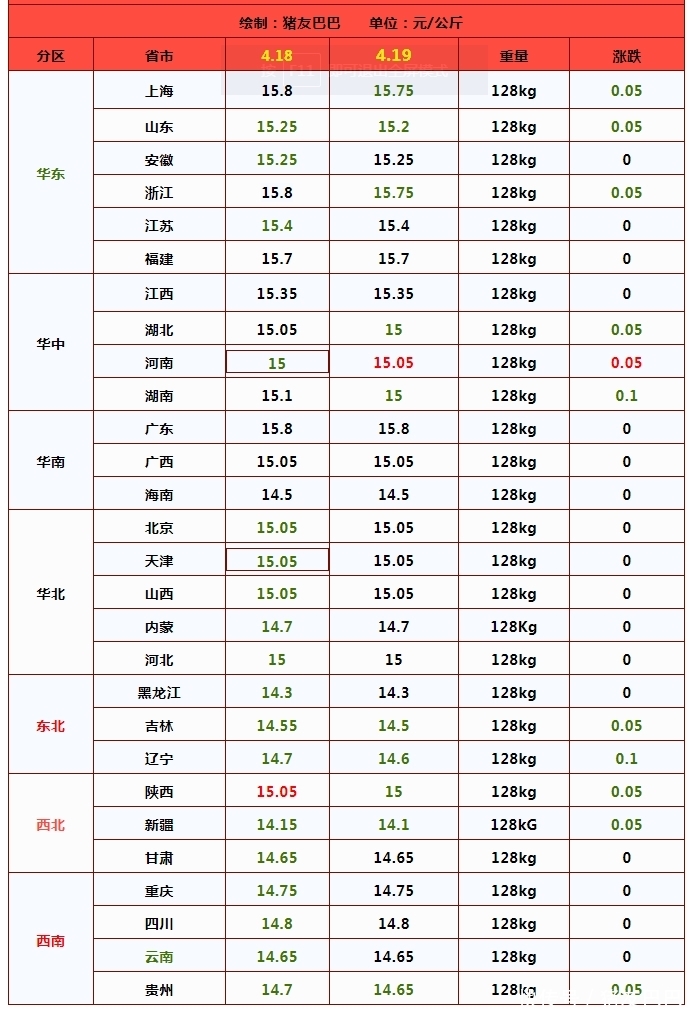 据数据分析,4月19日,外三元猪价在14.93元/公斤,环比昨日下跌0.02元,市场呈现大稳小动的局面,其中,在山东、安徽、浙江、上海、贵州、湖北、湖南、吉林、辽宁、陕西、新疆地区,猪价下跌幅度在0.05~0.1元,河南地区报价上涨0.05元/公斤,猪价呈现稳中下跌的走势!