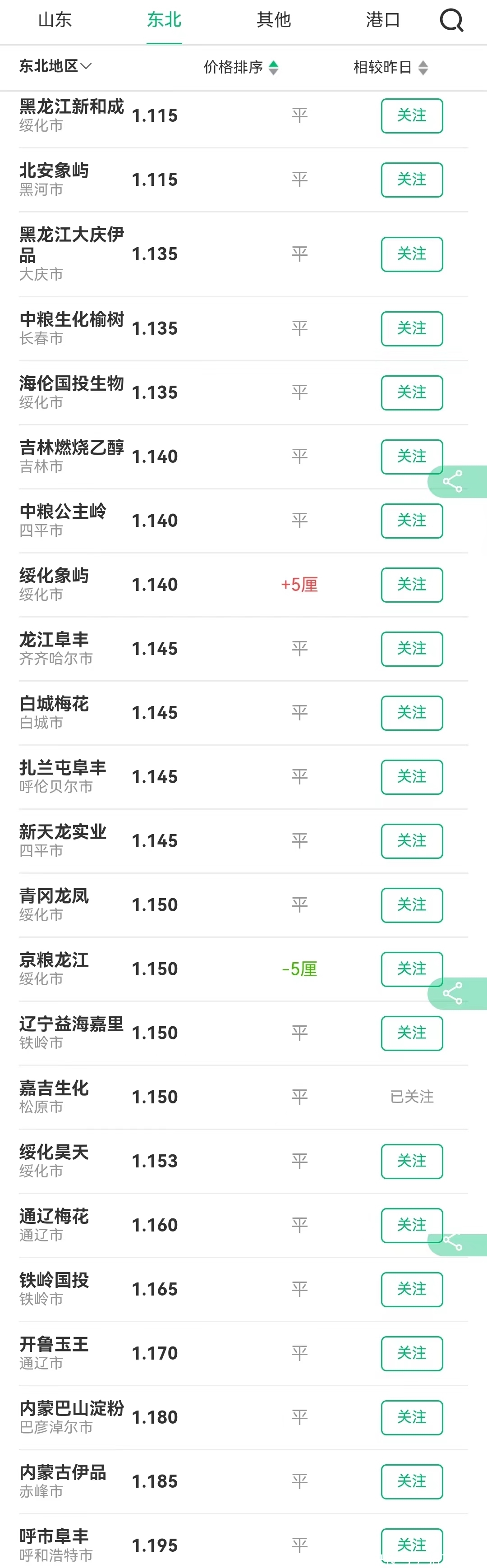 其中,在黑吉辽以及内蒙地区,绥化象屿上涨10元/吨,报价在1.14元;京粮龙江下跌10元/吨,报价在1.15元;黑吉辽地区主流玉米报价在1.115~1.195元/斤;