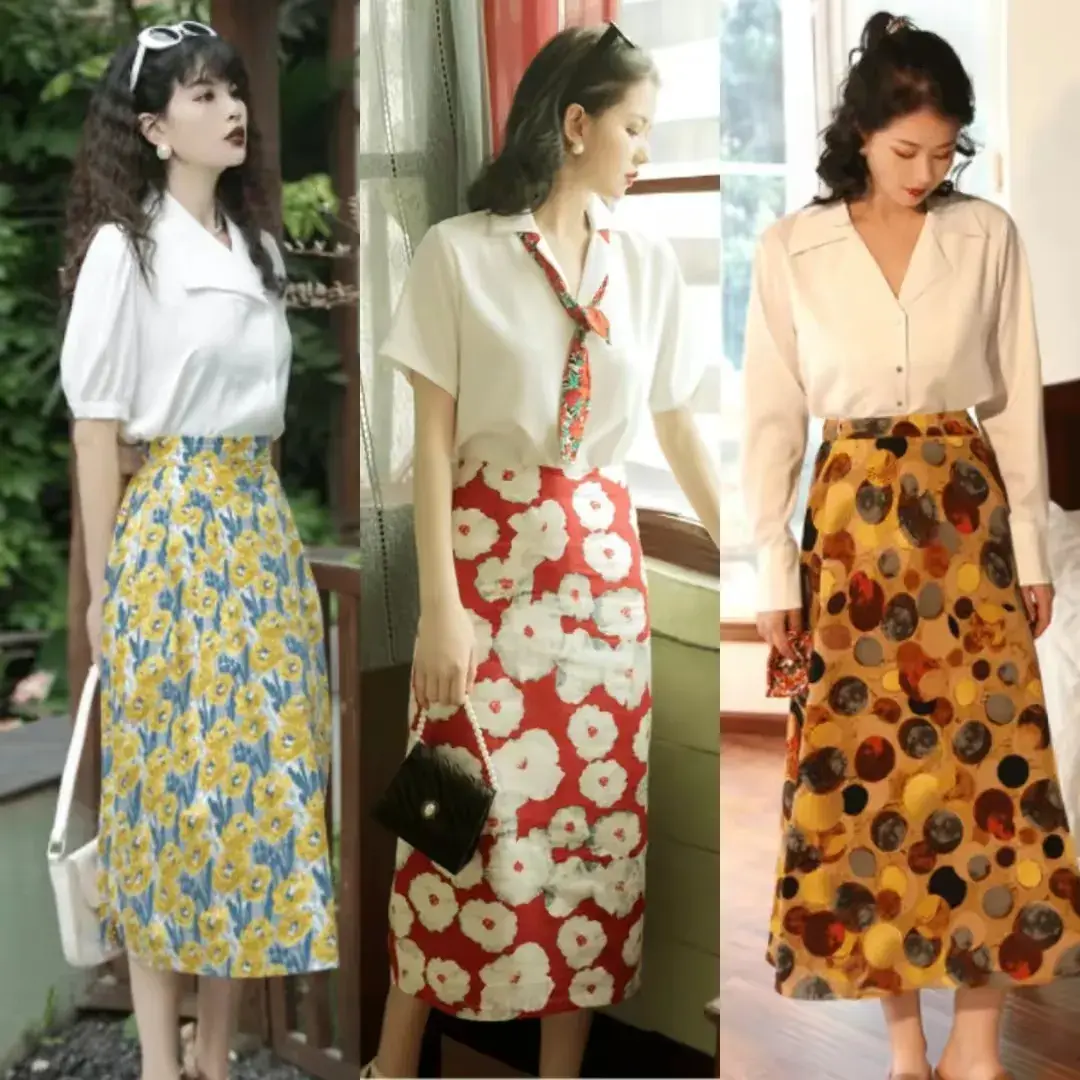 如果你想要俏皮复古的穿搭风格,可以选择印花的衬衫上衣搭配上伞状的半身裙,挎上一款时尚小包包,港风的气质就出来了。