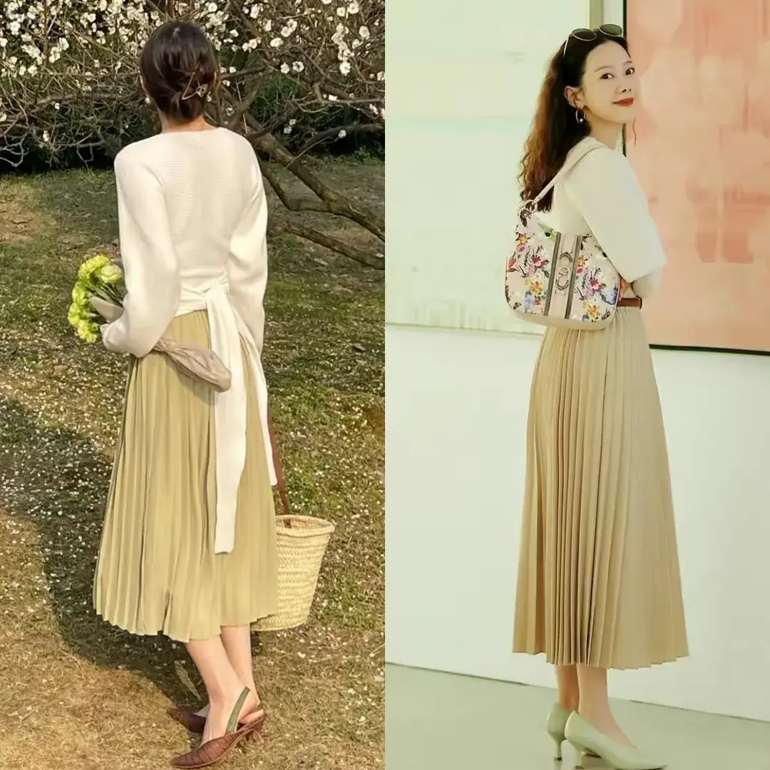 个人还蛮推荐大家选择百褶裙的,百褶裙天生就能散发出女性的魅力,而且垂坠感很好,上身之后摆动起来很优雅,而且百褶裙不挑年龄,也不挑身材,比例比较百搭。
