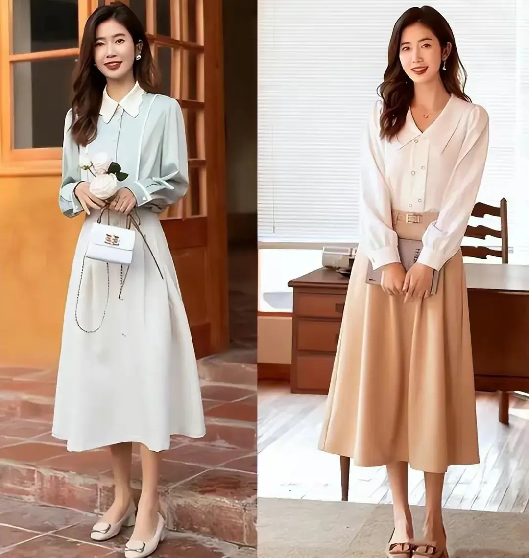 裙子的长度也决定了给人第一印象,向下面这两套穿衣示范裙子的长度,盖过膝盖,同时露出脚踝,适当的留白会让你更显高,而且得体又大方。