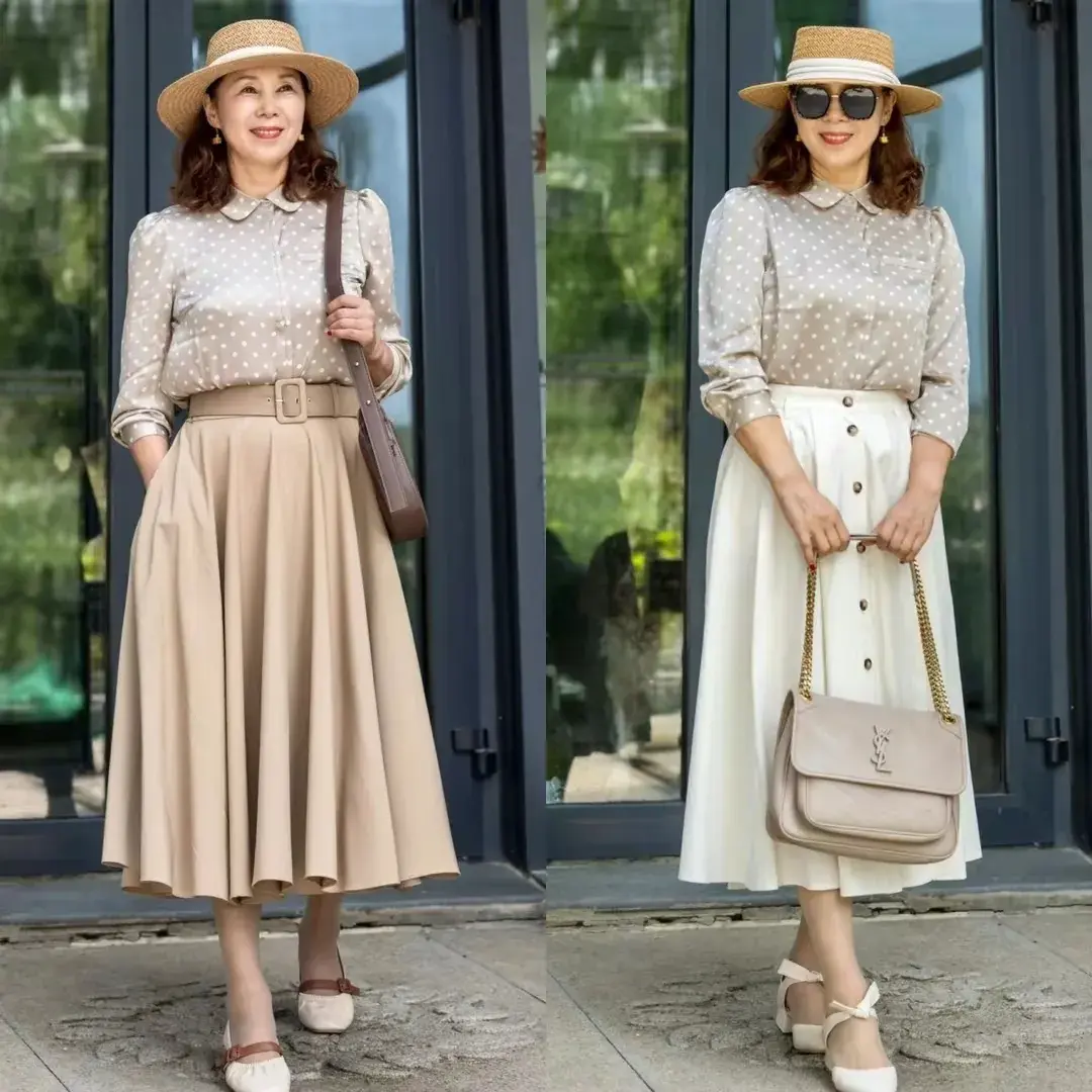 到了中年女性这个年龄段,身材始终会有一定的走样,我们需要把这些缺点藏起来,向腰间的赘肉,腿型粗,假胯宽等问题。选一件宽松的波点衬衫上衣搭配上压褶的半身裙,把衬衫扎进半身裙里面,勒上腰带,提升你的腰线,自然就能把肚子上的肉肉藏起来,出门旅游的时候可以加上草帽和墨镜,更加的精致,想要变得更加漂亮,配饰绝对是少不了的。