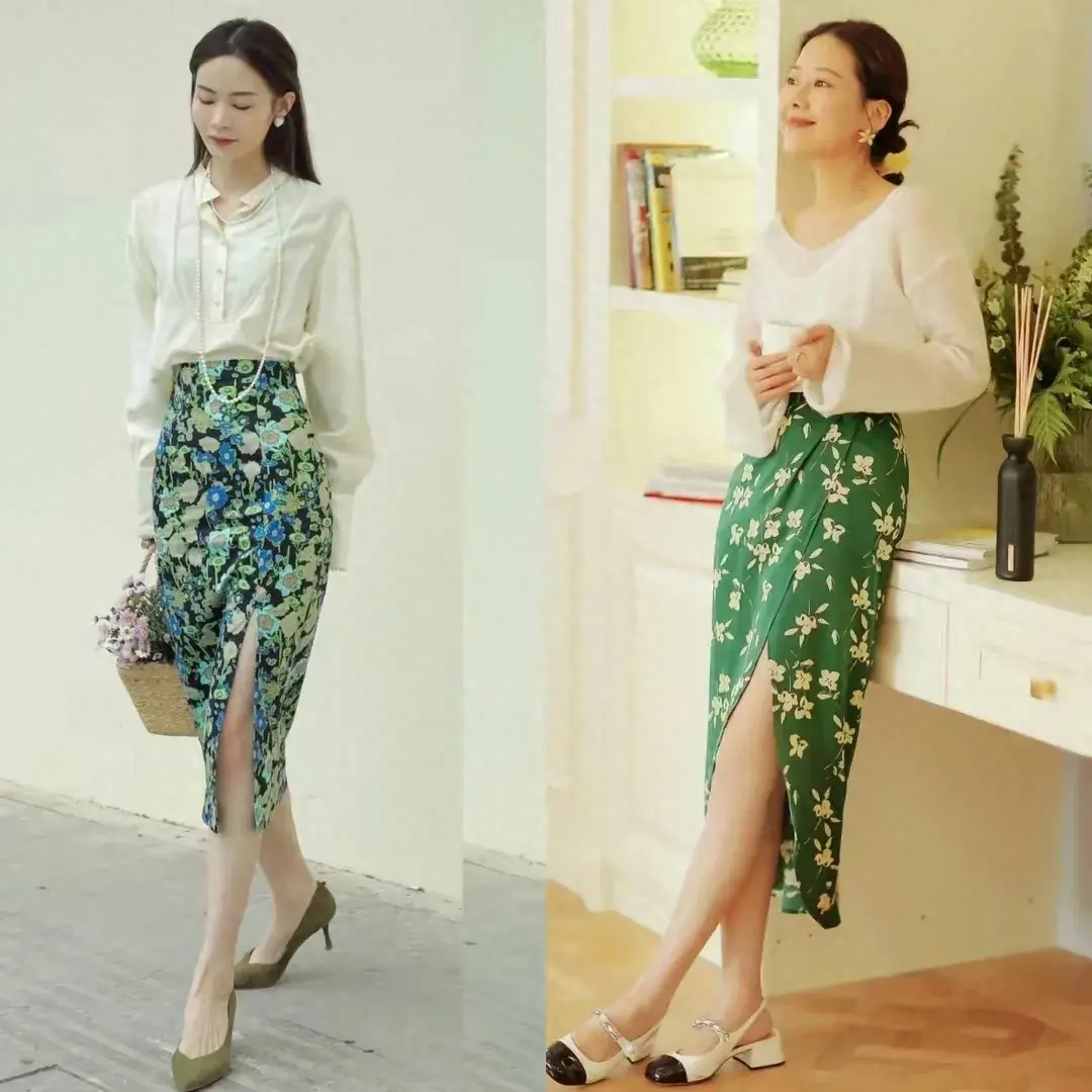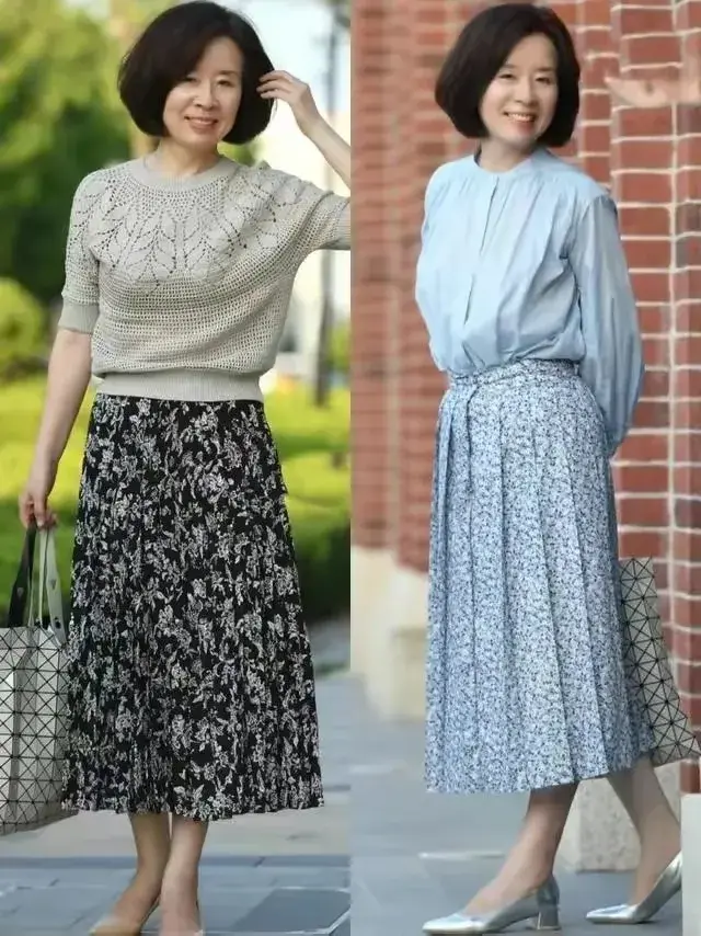 管是什么年龄段?衣服太花哨了,容易廉价。就算你想穿花哨的衣服,单品也要把它放在下半身,就像下面这两套穿搭也是选择了碎花裙。