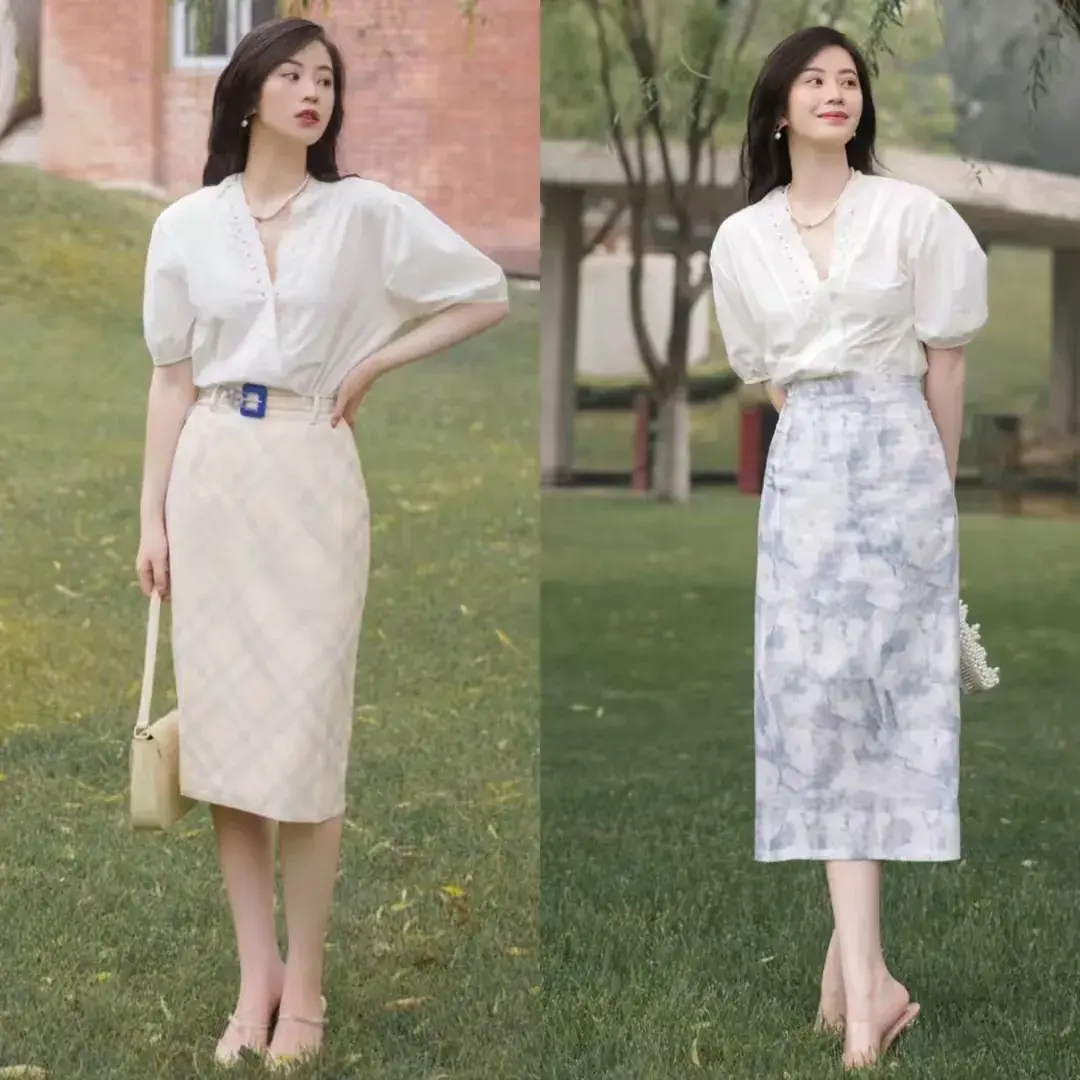 好比下面这一条包臀裙和泡泡袖衬衫,上衣组合搭配,不光能展现小蛮腰优势,还把好看的括号臀展现了出来,看起来确实很漂亮,高贵迷人。
